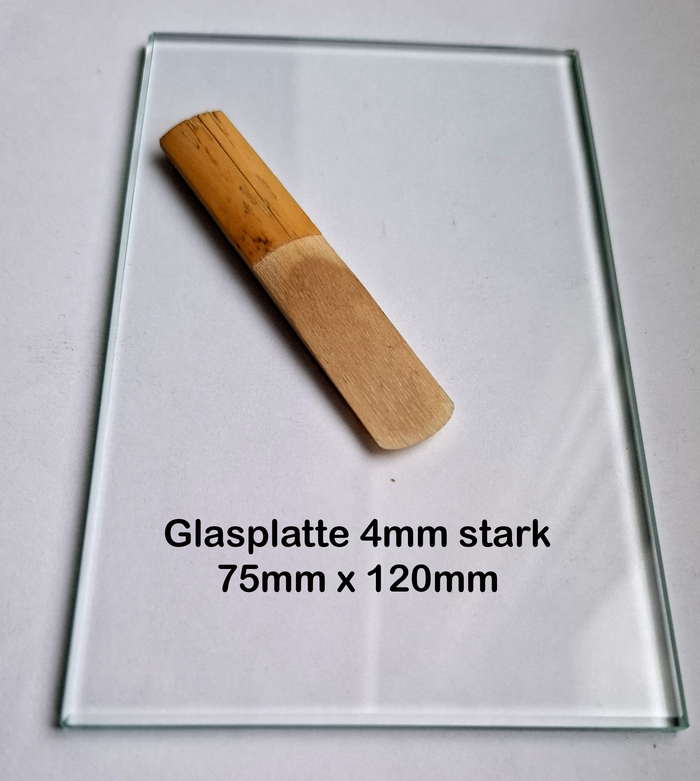 Die Glasplatte (Floatglas 4mm) hat eine Abmessung von 120 x 75mm. Aus Sicherheitsgründen sind alle Kanten zusätzlich geschliffen und poliert.