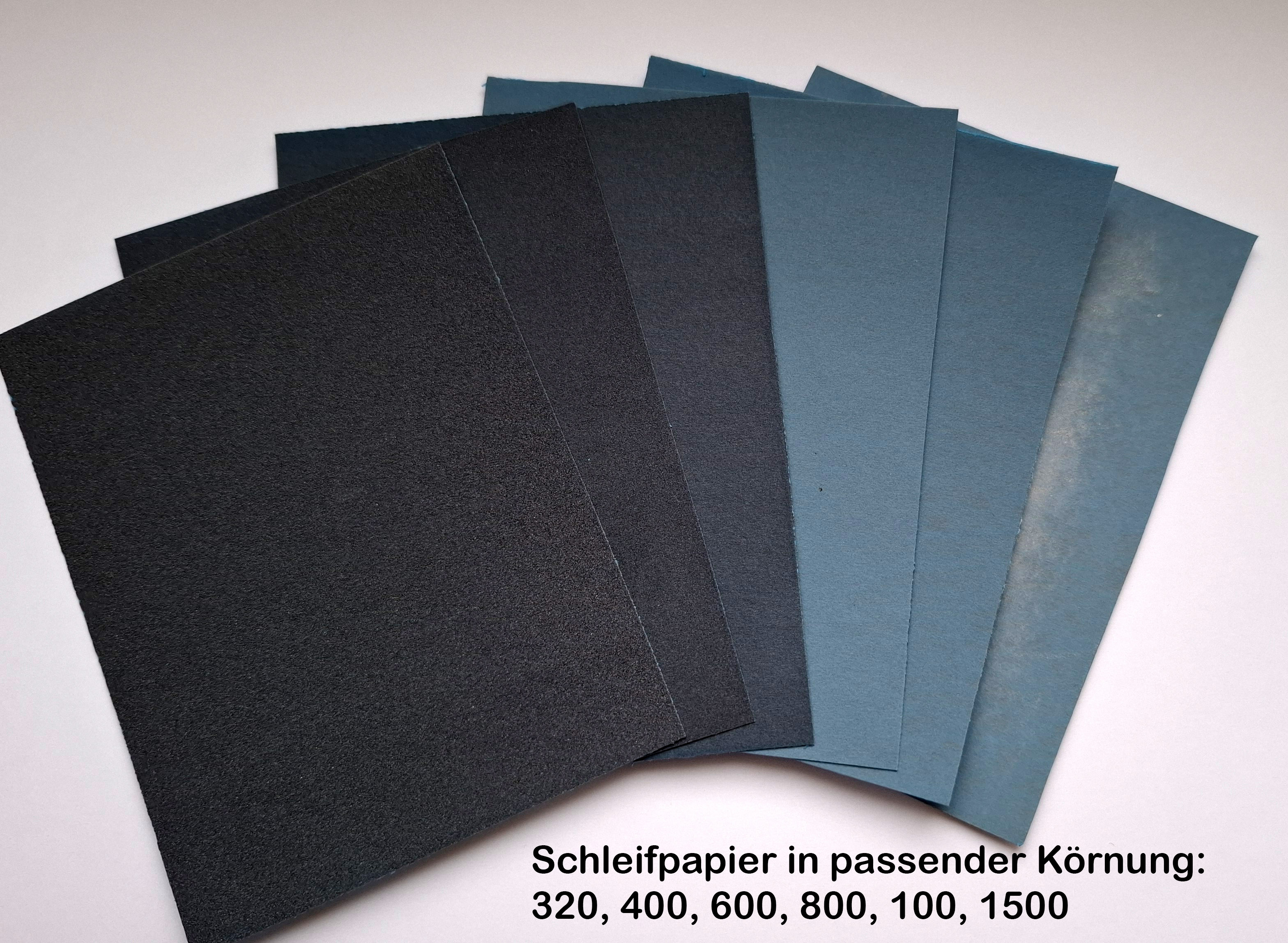 Um das Blatt zu schleifen (schmirgeln) liegen dem Set folgende Nass/Trocken Schleifpapier-Körnungen bei: