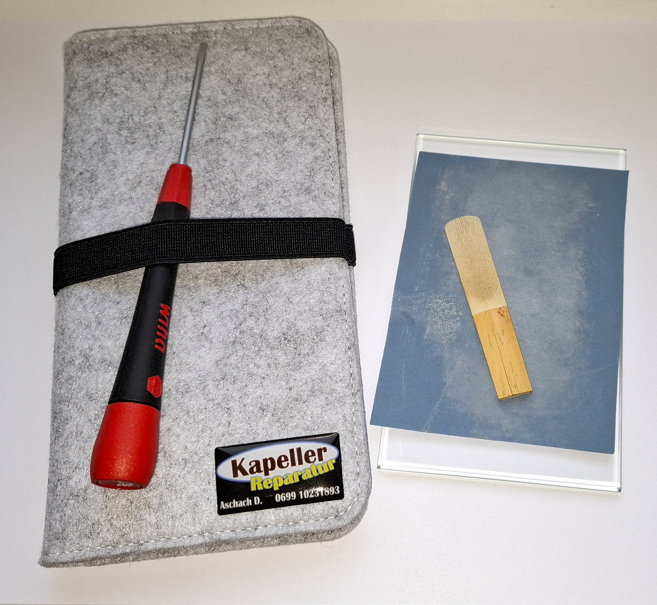 Dieses Set dient zum anschleifen und nachschleifen des Klarinetten- oder Saxophon-Blatt vor oder nach dem spielen. Speziell um Ausdehnungen durch Nässe zu korrigieren und Verschmutzungen zu beseitigen.
